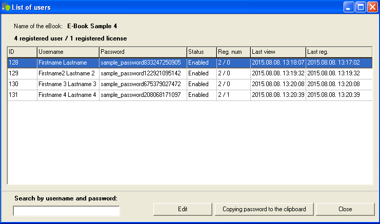 - You may change the number of maximum registrations to all passwords. If - for example - you want the users to be able to view your e-book from 5 computers instead of the originally provided 2, use this function. Then you will not have set these one-by-one.